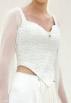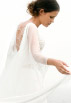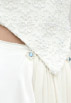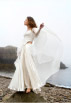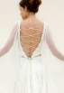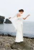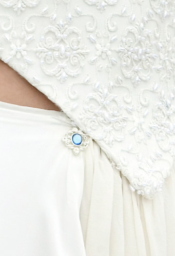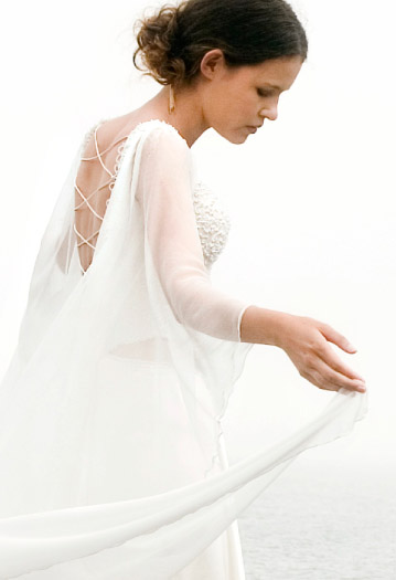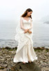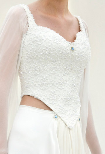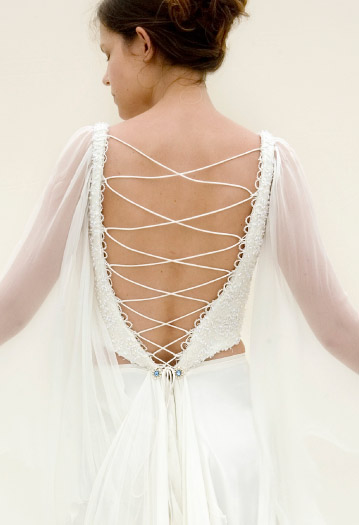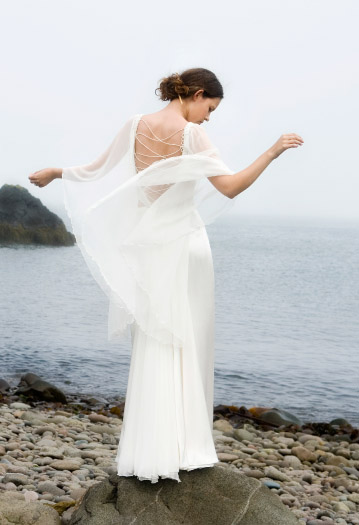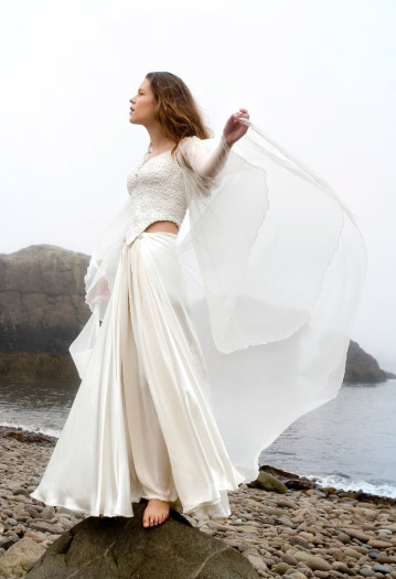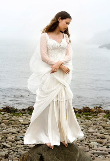 Angelica has a corset of heavily beaded lace with silk chiffon sleeves, which flow to below the wrist. The satin silk skirt is split down the front revealing gathers of champagne silk crepe with long plumes of silk chiffon on the back.
