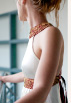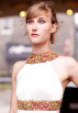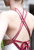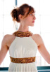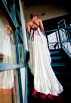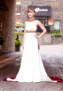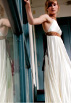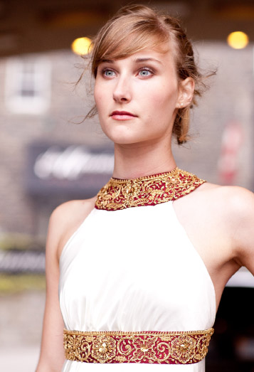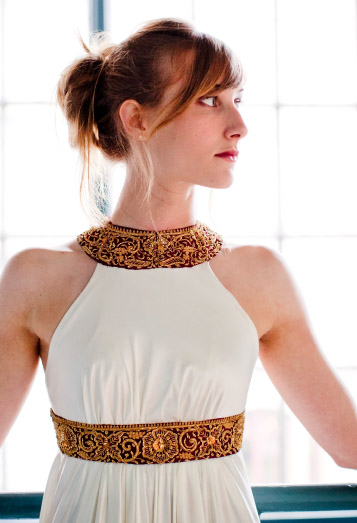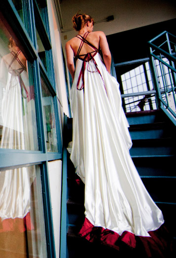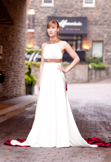 This gown has an empire waist and high collar of red silk, elaborately embroidered with gold thread. A flowing train has a ruffle of gathered red silk which can be bustled to floor length for ease and comfort.