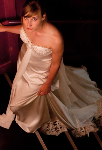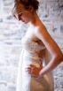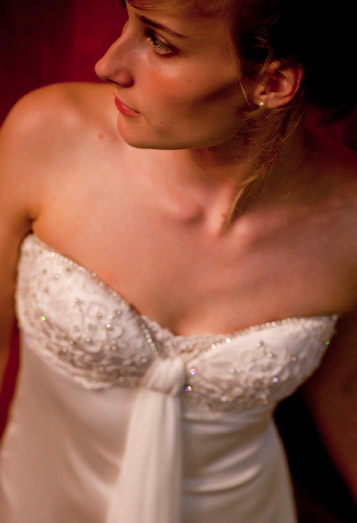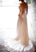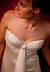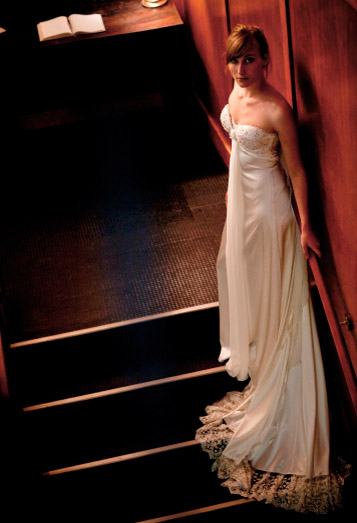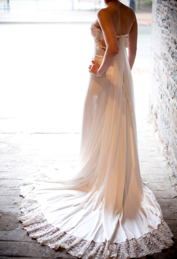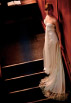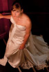 This simple silk sheath has beaded silk breasts with rhinestone decoration. Silk chiffon plumes fall down front and back of the gown and beaded rhinestone lace is gathered along the full train.