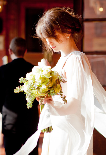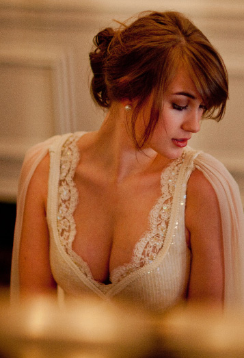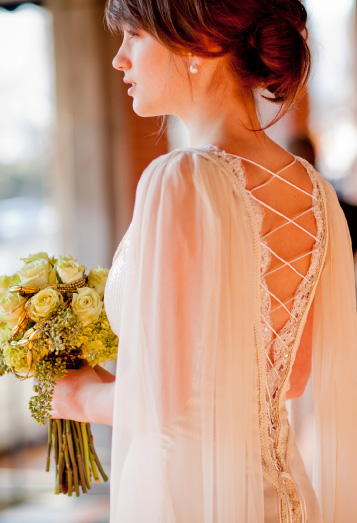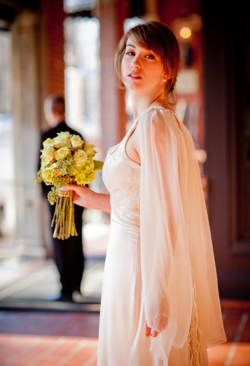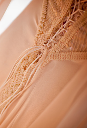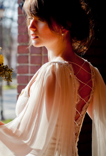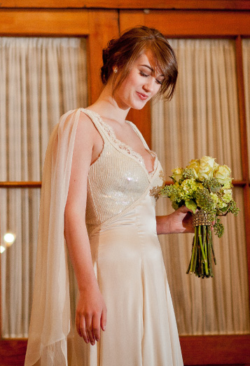 The bodice of this gown is vintage sequinned silk with a collar of vintage lace and braids. The skirt is antique satin silk and the sleeves are gathered vintage silk chiffon.