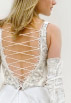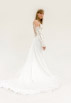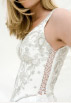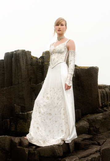 The silk bodice is embroidered with silver thread, sequins and beads, lacing up on both sides and the back. The skirt is satin silk with a front split revealing more embroidered silk; tight silk gloves lace up the arms, leaving the shoulders bare.