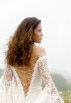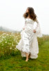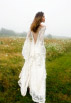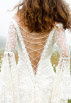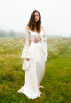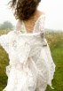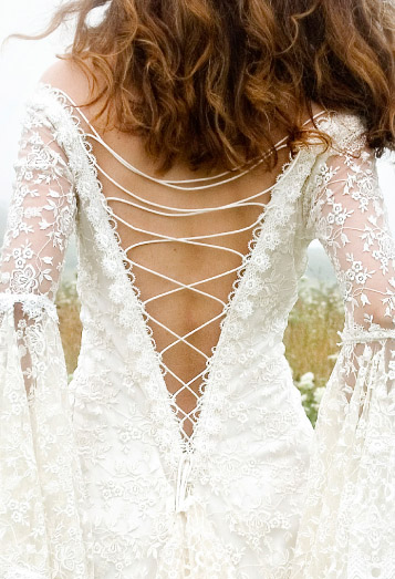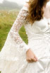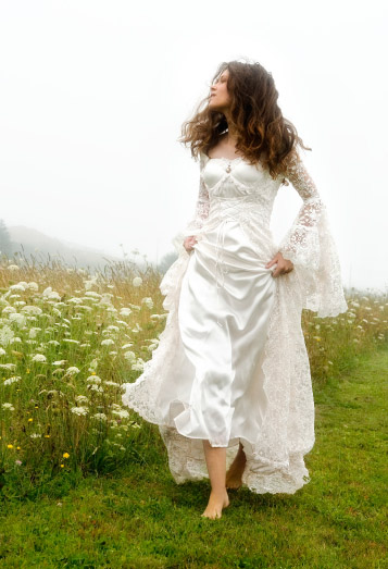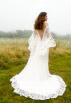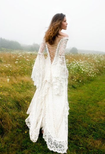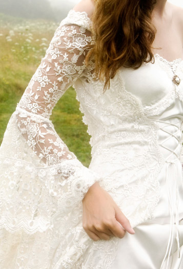This gown has an under dress of satin silk which is covered in lace, splitting in the front. Full lace sleeves are tight to the elbow and fall below in generous gathers.