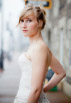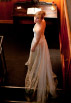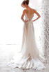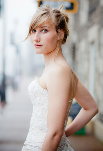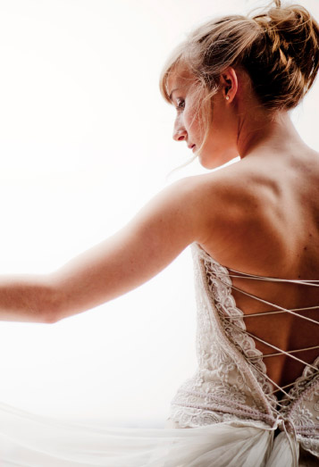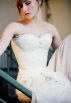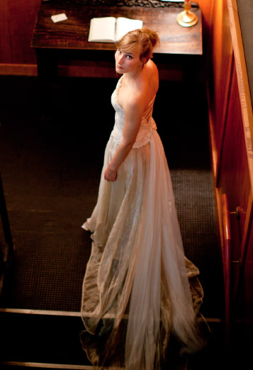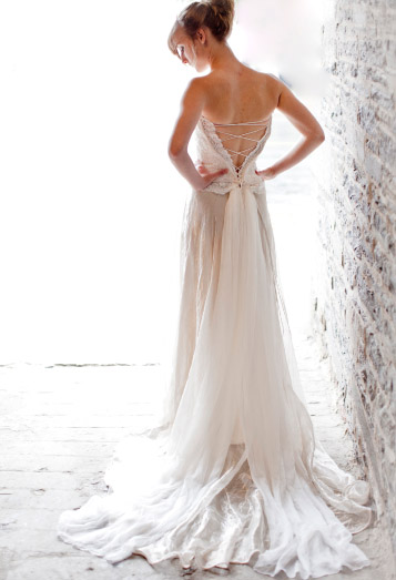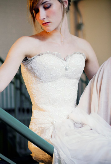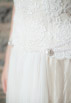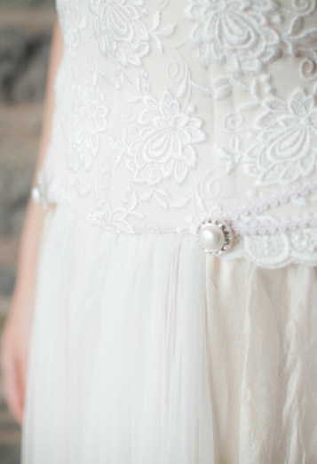 This gown has a corset of Rosebud lace with a skirt of many fabrics. Metallic silk organza, antique silk and silk chiffon are layered together in hues of ivory, beige, and natural white. Gathered organza and lace decorate collar and waist.