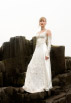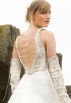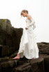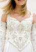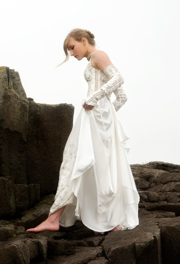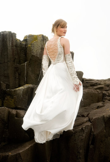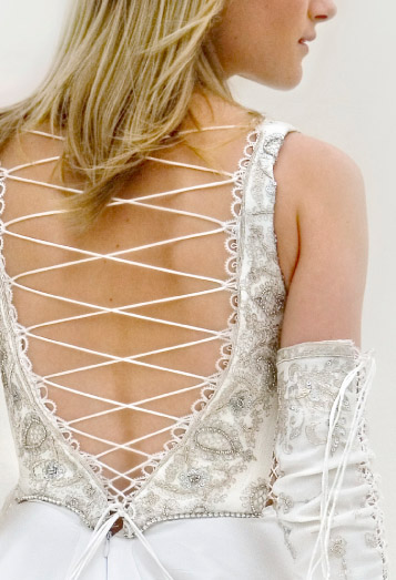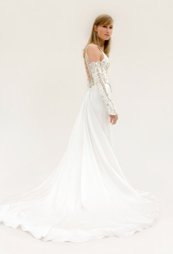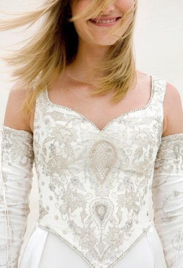 The silk bodice is embroidered with silver thread, sequins and beads, lacing up on both sides and the back. The skirt is satin silk with a front split revealing more embroidered silk; tight silk gloves lace up the arms, leaving the shoulders bare.